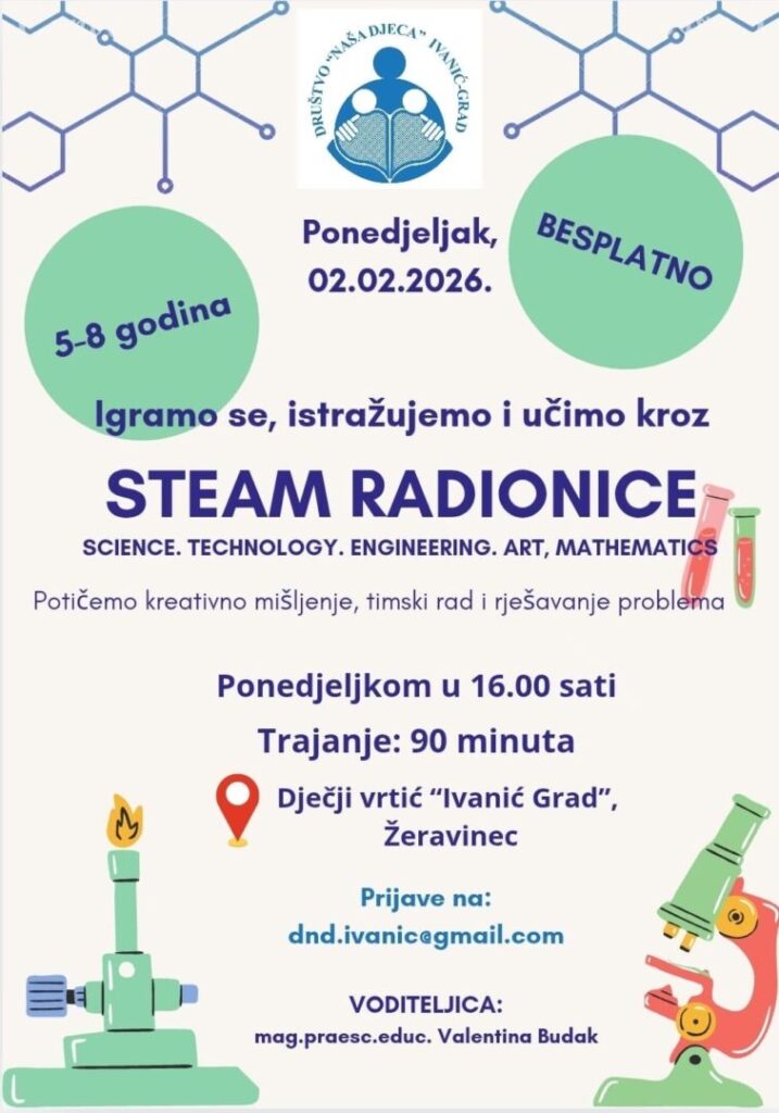 U ponedjeljak 2. veljače u 16:00 sati počinju STEM radionice kojima se potiče kreativnost, timski rad i rješavanje problema. Održavat će se u objektu Dječjeg vrtića Ivanić-Grad na Žeravincu.