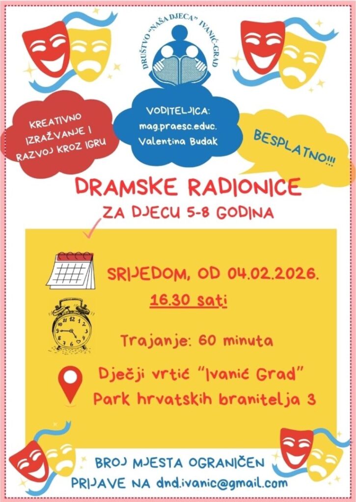 Istog tjedna, ali u srijedu 4. veljače u 16:30 počinju dramske radionice kreativnog izražavanja kroz igru. Lokacija održavanja će biti centralni objekt u Dječjeg vrtića u Parku hrvatskih branitelja u Ivanić-Gradu.