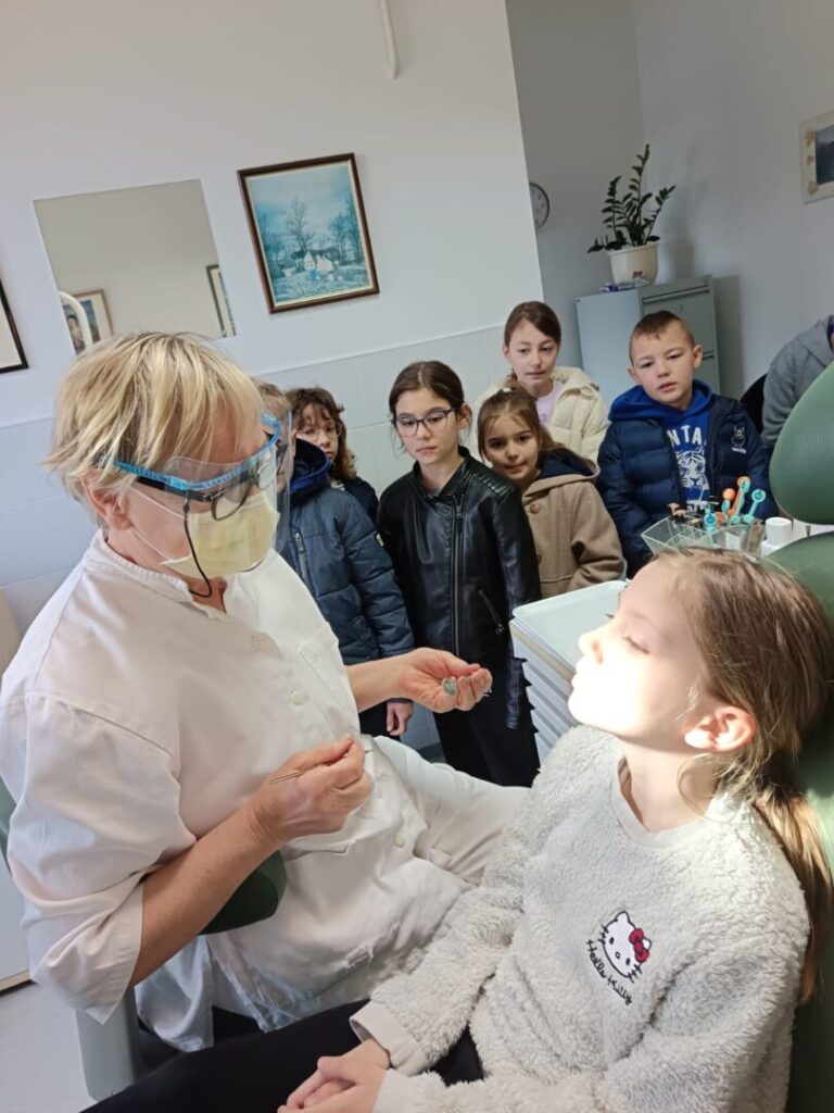 Stomatologinja je s učenicima razgovarala o važnosti pravilne prehrane, redovitom pranju zubi te redovitom odlasku na preventivne preglede. Liječnica i medicinska sestra pokazale su djeci što sve koriste u svom radu kada k njima dođu pacijenti (stetoskop, tlakomjer, zavoje, …).